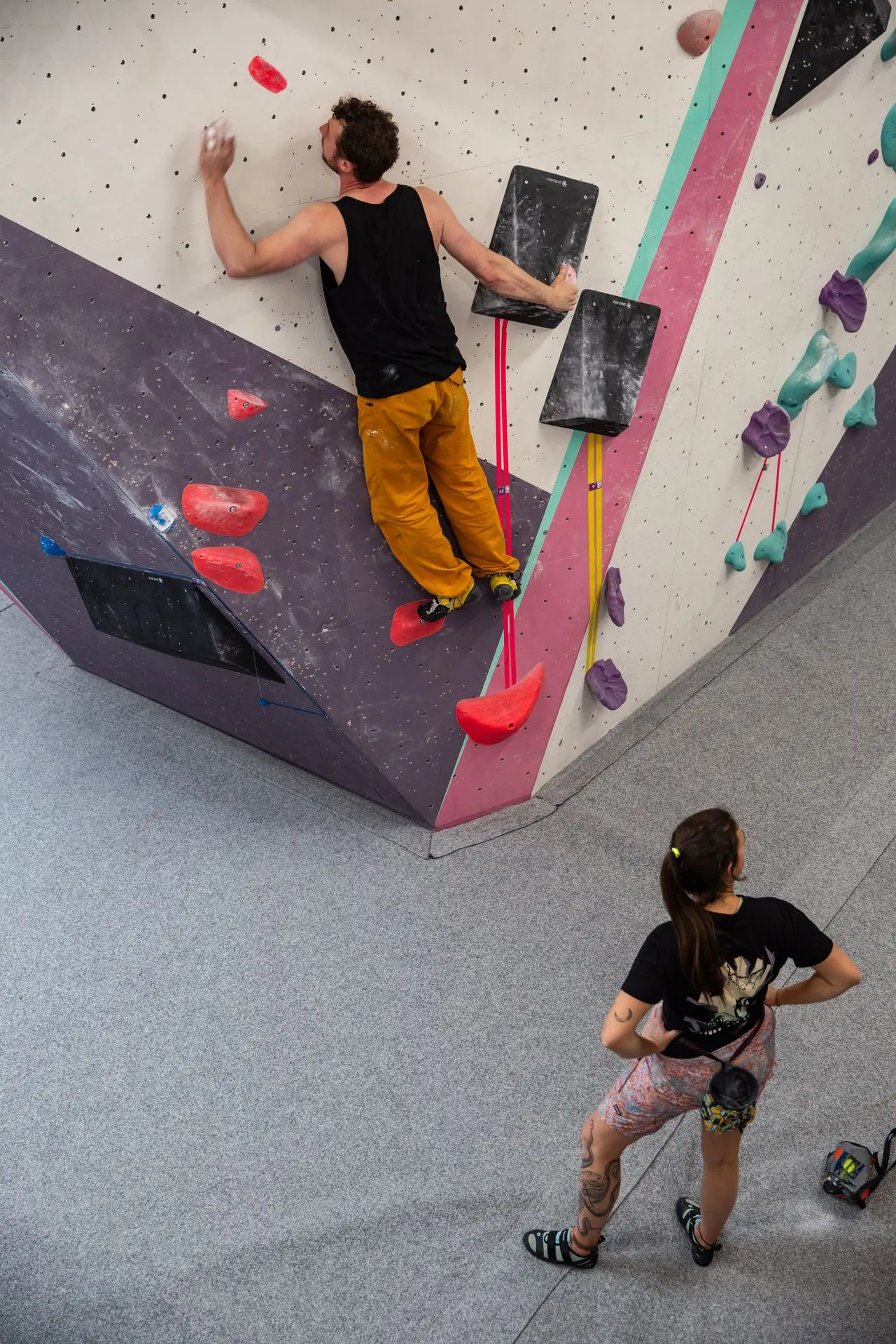 De boulderzaal is perfect voor je eerste stappen op een klimmuur. Geen knopen leren, geen harnassen nodig, alleen een paar schoenen en veel energie!